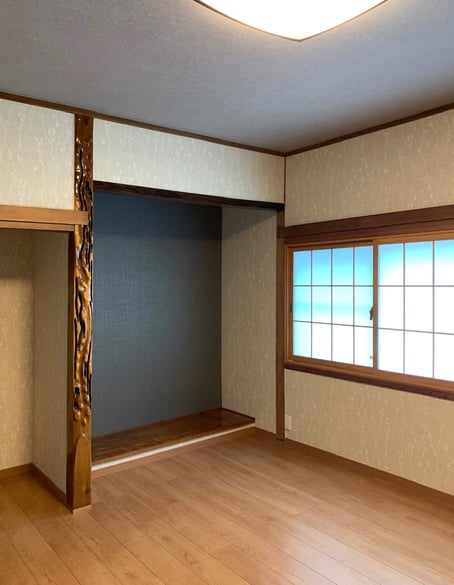 元の和室の造作材、床柱、床の間床、長押などは残しました。壁には落ち着いた花柄のクロスを貼っています。