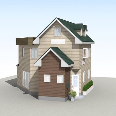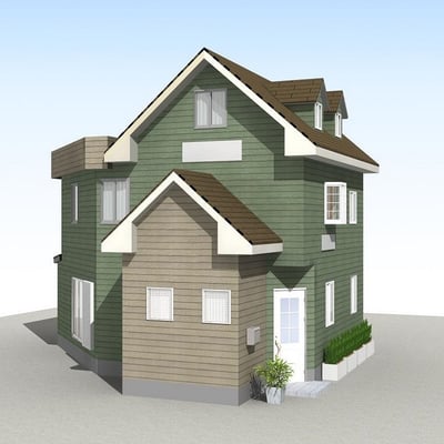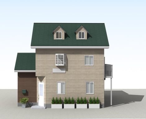 【B案】焦げ茶の屋根、グリーンの外壁。破風の色をホワイトにするとまたA案とは違った印象になります。