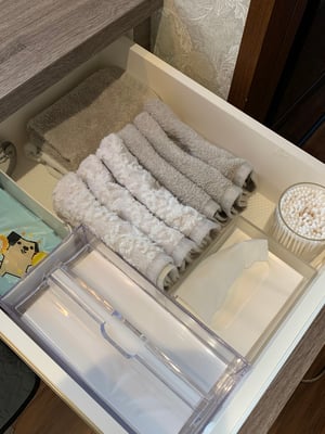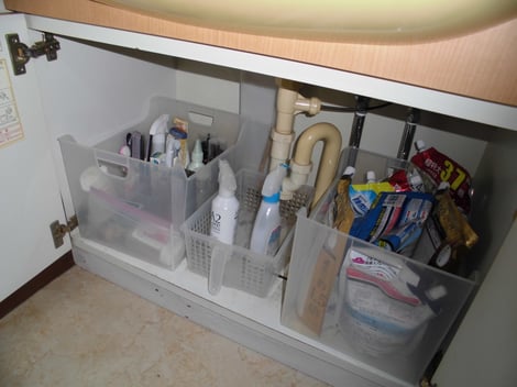 以前は、洗面下の観音扉の中に入れていたので、物の出し入れもストック量の管理もかなりしやすくなったと思います。