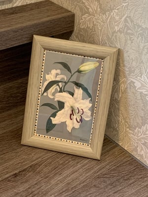 奥様が気に入られたウィリアムモリスの壁紙。カウンターの上に飾られたお友達のアーティストさんが描かれたという百合の花の額とも雰囲気ぴったりでした!