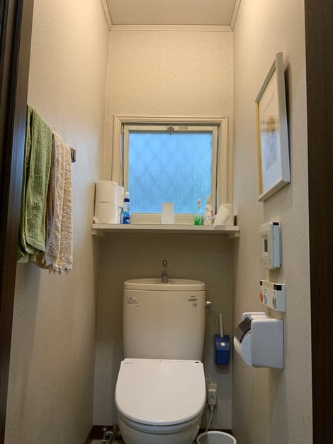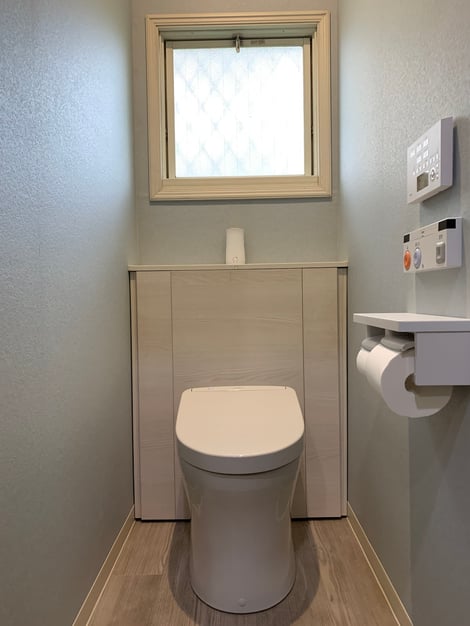 優しい色のホワイトウッドのキャビネットのトイレ。棚まわりもすっきりしました。