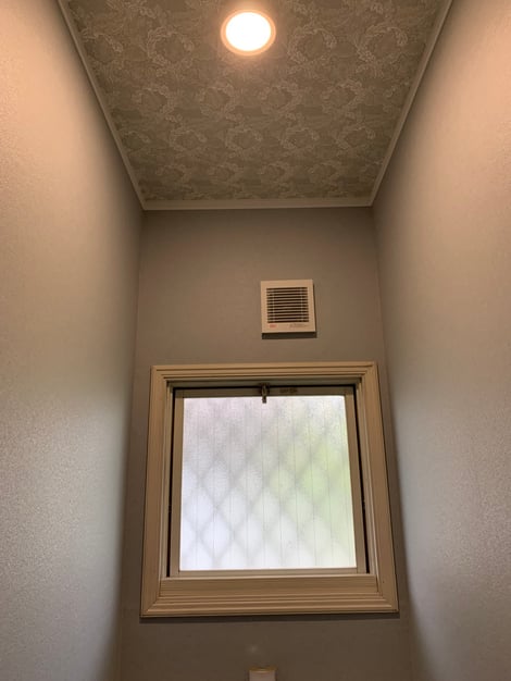 奥様のこだわりで、壁にはお手入れしやすい機能性クロス(汚れ防止機能があるもの)を貼って、天井に柄のクロスを貼りました。落ち着いた色味でトイレの内装も一新することができました。