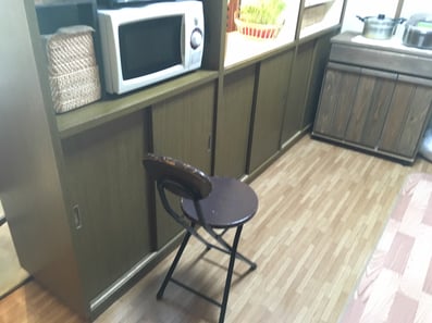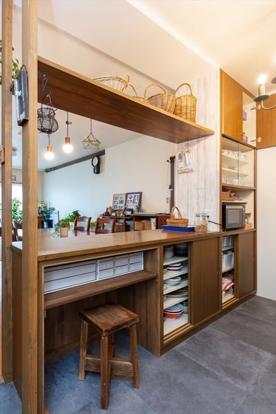 もともとは造り付けで両面から使える収納でしたが、背が高いのでキッチンとダイニングを分断する形になり使いづらかったので、前回のリフォームで一部分の収納をとってキッチンとのつながりがでるようにしました。