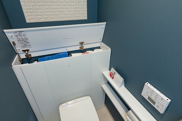 便器と後ろの棚のふたが開くようになっていてトイレットペーパーのストックなどがいれられるようになっています。これなら出しいれも簡単にできて安心です。