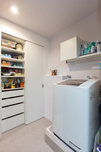 今回のリフォームでは思い切って洗濯流しは撤去して、新たに引戸をつけたパントリーを造作しました。冷蔵庫前はかなりすっきり!