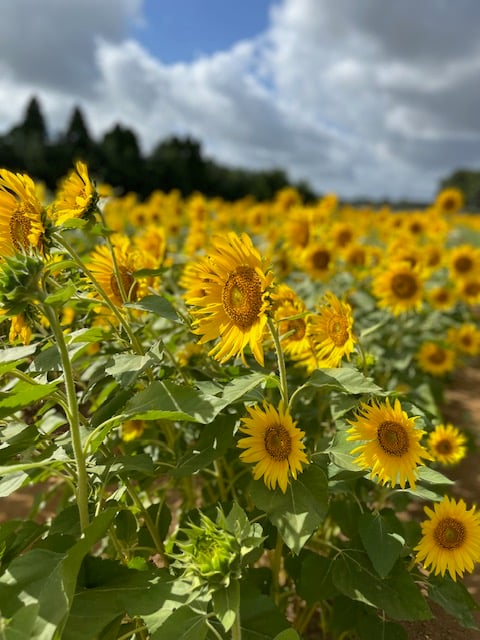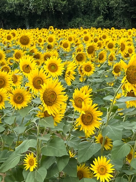 夏の日差しとどこまでも続く黄色いひまわり、満開でした。