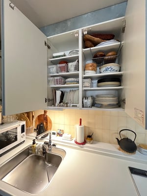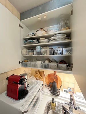 背面の食器棚がなくなったので、その分の食器がいれられるように、長さ90センチの長い吊戸を設置。手の届くところに
