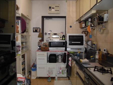リフォーム前のキッチン。勝手口をふさいでいたレンジ台。卓上の食洗機がキッチンカウンターの上に乗っていました。キッチンまわりに物があふれている感じです。