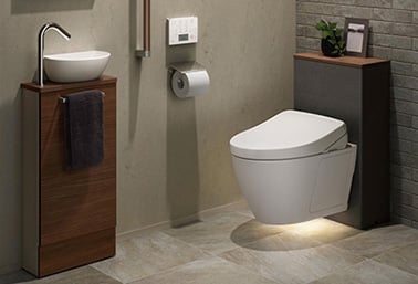 おなじみ、収納付きトイレレストパルのフロート版です。便器の後ろにキャビネットがついているので便器の後ろの隙間はなく、便器の下の掃除もラクラクです。