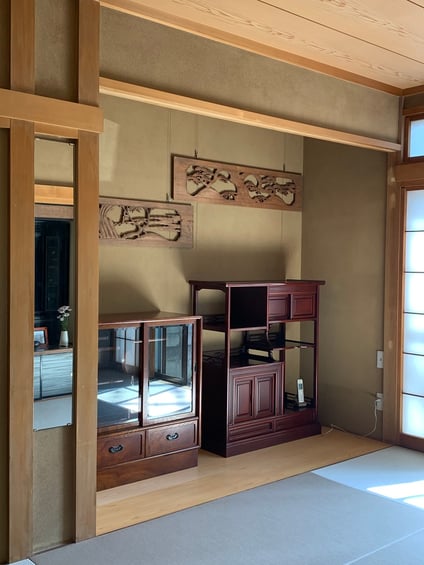 もとの和室についていた欄間は丁寧に外して、隣に残した和室にお引越し。床の間にアートのように飾ってみました。「思い出」をこちらもよかったです!