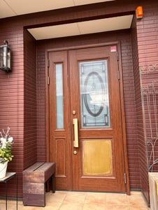 クラシック調でデザイン的にも素敵な玄関ドアだったのですが、日当たりが良いせいかアルミ材に貼ってある木目のシートがすっかりとれてしまい傷みが目立っていました。