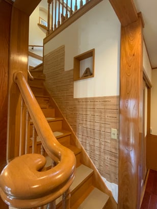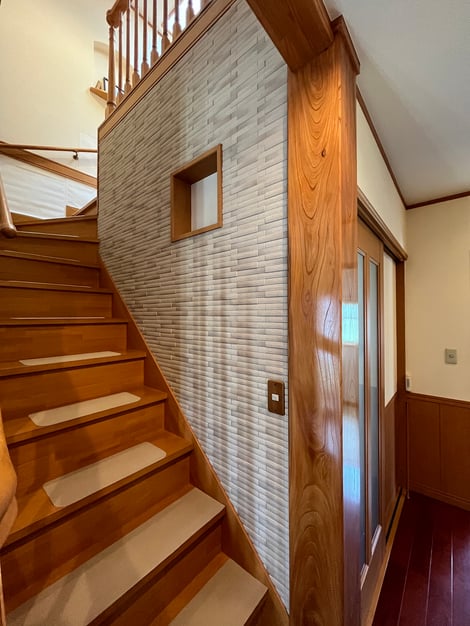 猫ちゃんを飼っているA様。階段脇の壁は猫ちゃんによる傷でいたんでしまっていて、気になるところは英字柄の紙を貼ってカバーされていました。