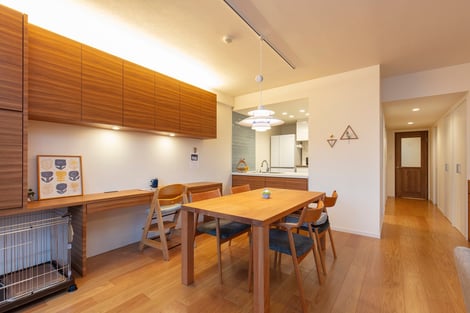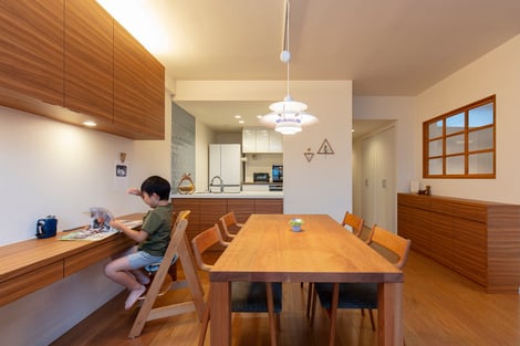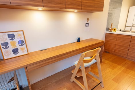 当時から、子供たちが大きくなっても部屋にこもるようにはしたくないのでなるべくリビングで過ごせるように・・・とダイニングテーブルの脇にカウンタースペースを作りました。」