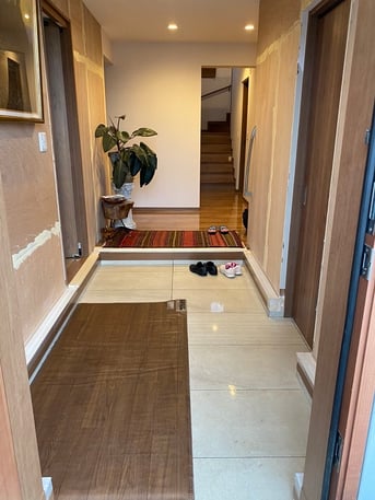 もともと広い玄関ホールでしたが、ストーンお客様がオーダーしてご用意されたレリーフという大きな石の飾りを飾りつつ、タイル貼りの玄関ホールをデザインしました。