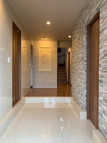 スティックストンという天然石のボーダータイルを使った玄関ホールの事例です。