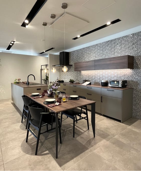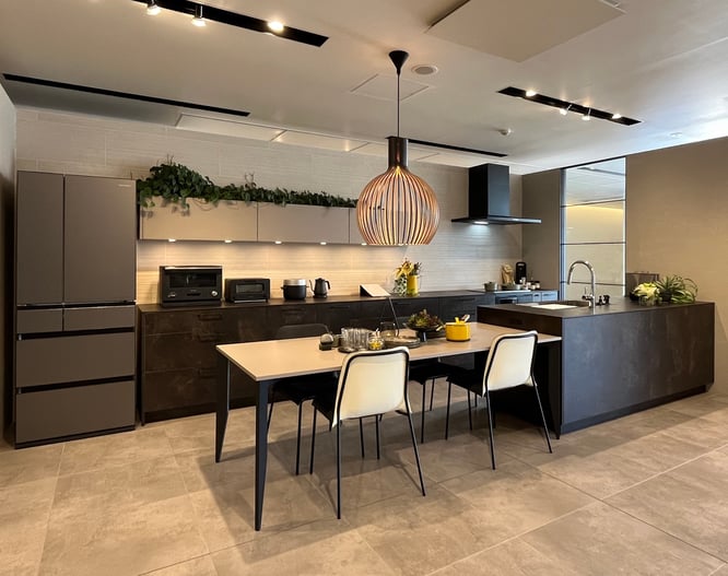 スタイリッシュなキッチンの雰囲気に合わせて、照明器具やタイル、食器類などもトータルでコーディネートされているのでとてもおしゃれです!