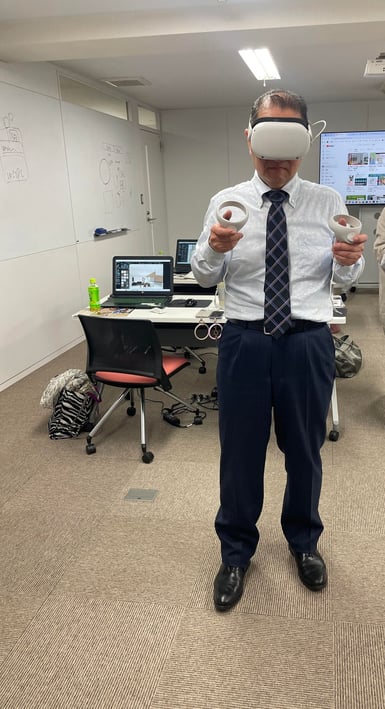 社長が身に着けていらっしゃるのはVR(バーチャルリアリティ)の機械。