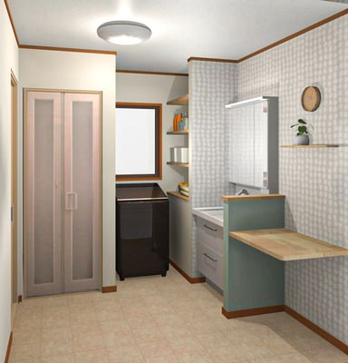 今回は床や天井はそのままで洗面化粧台のまわりの壁紙のみの交換だったので、どんなものを貼るか事前にパースでシュミレーション!明るいイエローにするか落ち着いたグレーにするか迷われていましたが、完成はこちら↓