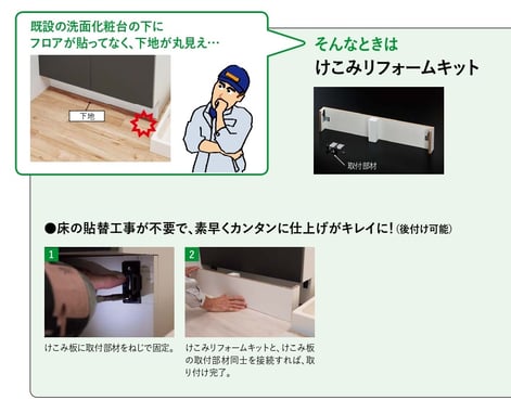 今回の工事では床は既存のままだったので、けこみリフォームキットという部材を使用しました。