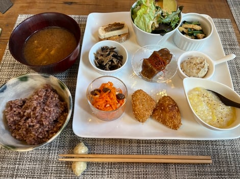 ランチのメニューは、オーガニック野菜たっぷり、玄米ごはんとお味噌汁がセットの身体にやさしいごはん。