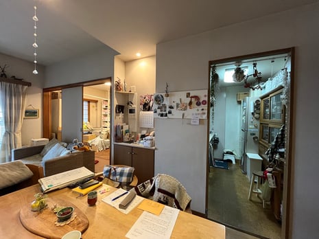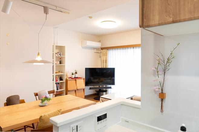 リフォームしてキッチン脇の壁を一部分取り払ったことで、リビングまで視線が抜けて、窓からの光もキッチンまで届くと同時にエアコンの風も台所まで届くようになりました。