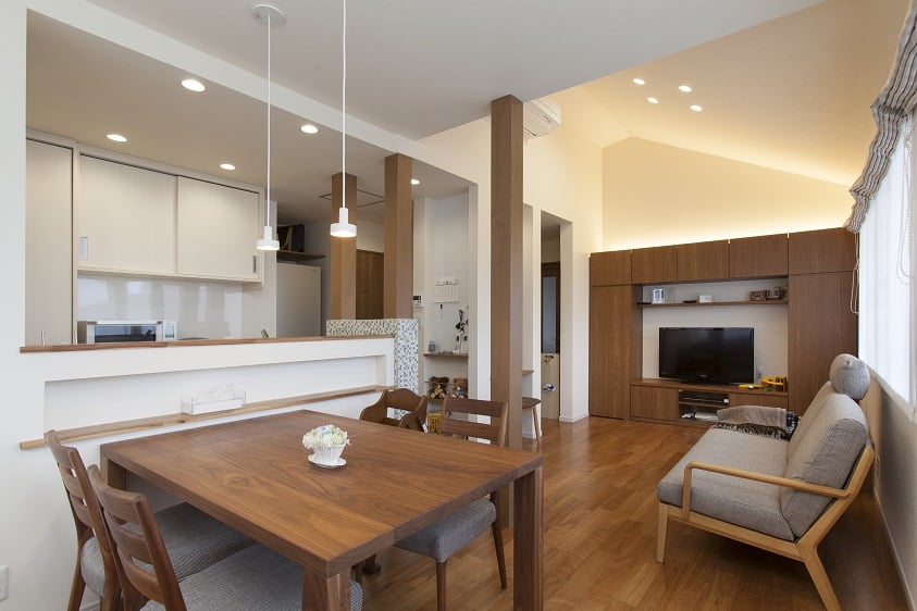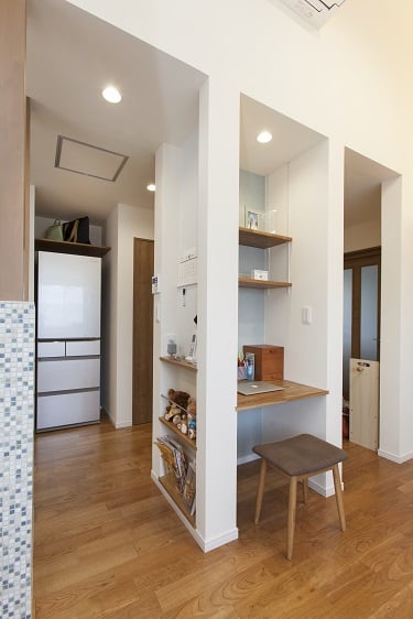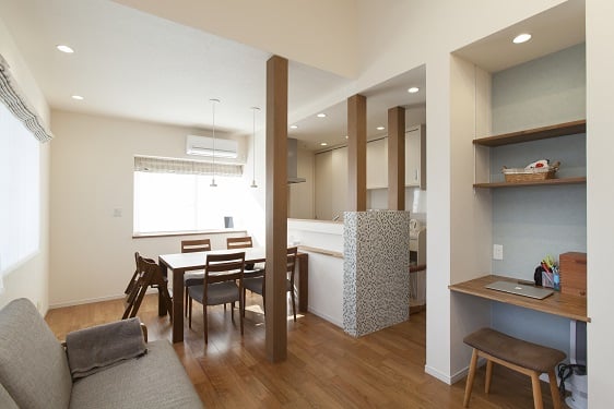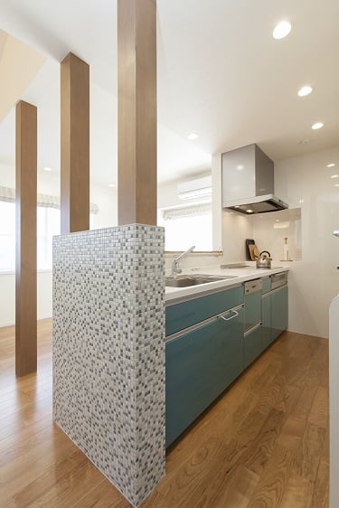 個室が3室あった2階の間仕切りを変更して、二世帯住宅の子世帯が住まえるようにリフォーム。もともとあったロフトを撤去して吹き抜けにすることで明るく開放的なLDKになりました。コンパクトながら収納たっぷりのキッチンスペースには、奥様の気に入られたターコイズブルーのシステムキッチンを設置。構造上残した3本の柱を塗装してモザイクタイルを貼ることで空間のアクセントになり、キッチンに立つのが楽しくなりました。