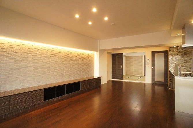 広くなったリビングには、広いカウンターのテレビボードを設置。壁面にはエコカラットタイルを貼り、間接照明を入れることで落ち着いたくつろぎ感のあるリビングになりました。