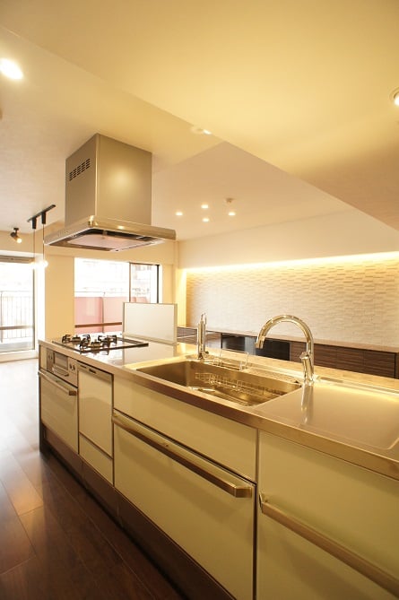 中古マンションをご購入されてリノベーション。閉鎖的だったキッチンの壁をとり、ペニンシュラ型のオープンキッチンを設置しました。気に入られたステンレスキャビネットのキッチンは、お手入れもしやすく収納力も抜群です!